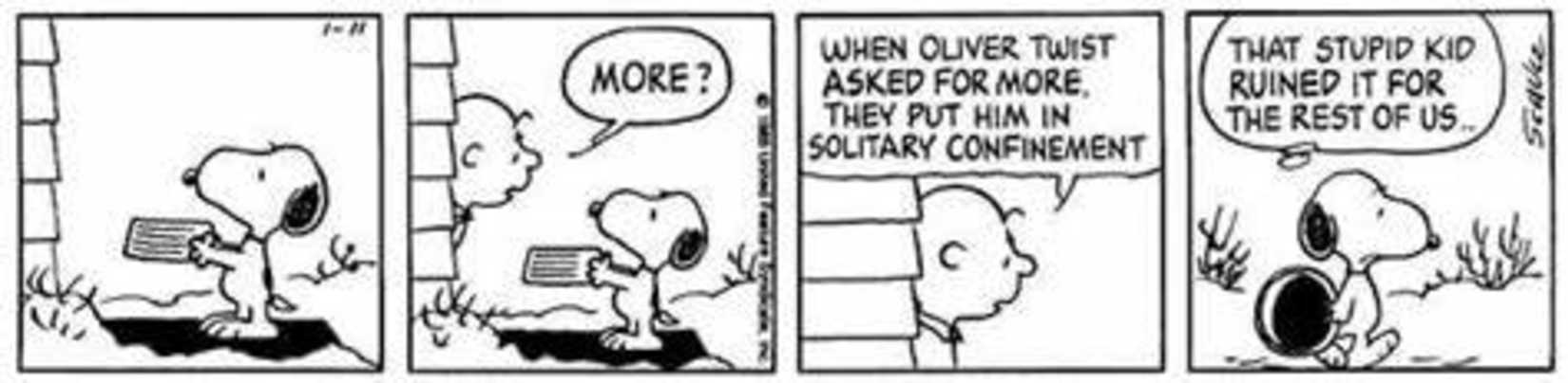 Cuando Snoopy toma una página de un clásico de Charles Dickens y pide más comida, Charlie Brown menciona el desafortunado evento que le sucedió a Oliver Twist cuando pidió más comida: el confinamiento solitario. Snoopy se va sin una segunda ayuda y se queda molesto por el “niño estúpido” Oliver Twist, quien “lo arruinó“para todos los que alguna vez han querido más comida.