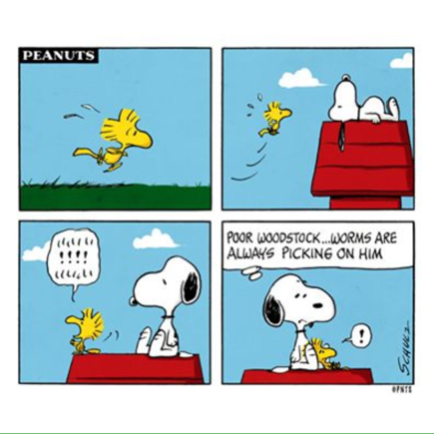 Aunque los gusanos suelen ser presa de los pájaros, en esta franja, el pobre Woodstock está experimentando todo lo contrario: algunos gusanos lo molestan. Está en la naturaleza amable de Woodstock no comerse instantáneamente a los gusanos mezquinos. El lado positivo es que Woodstock tiene un gran amigo con quien desahogarse cuando ha tenido un largo día lidiando con matones.