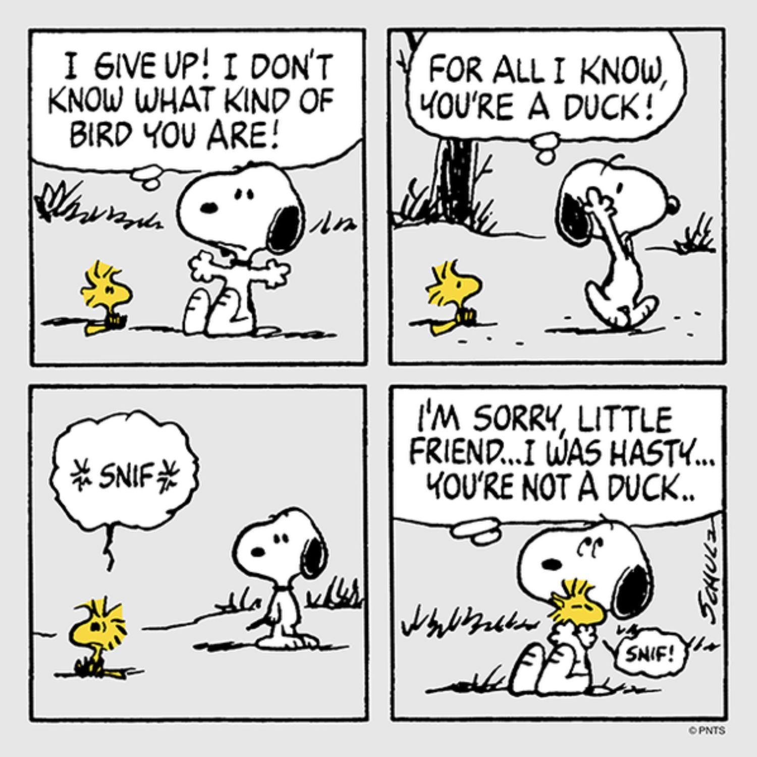 Al límite de su ingenio, Snoopy se da por vencido y afirma que Woodstock es un pato, ganándose la indignación y la ira del pájaro. Sin embargo, a diferencia de su relación con Charlie Brown, Snoopy extiende una rama de olivo y calma a Woodstock. Ver a Woodstock y Snoopy abrazar sus diferencias siempre es un espectáculo digno de ver y digno de mención viniendo del impulsivo cachorro.