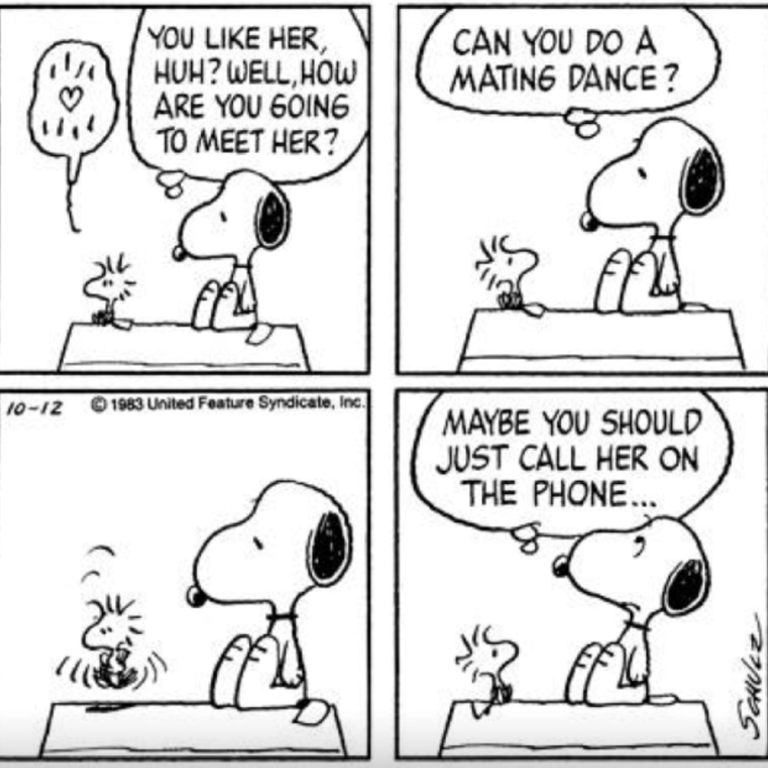 Snoopy intenta darle a Woodstock algunos consejos sobre la chica que le gusta en esto Miseria banda. El método de cortejo de Snoopy es bailar, pero al ver la versión de Woodstock, intenta decepcionar a su amigo sugiriendo una simple llamada a la chica de su interés. Woodstock tiene sus talentos, pero el baile no es uno de ellos.