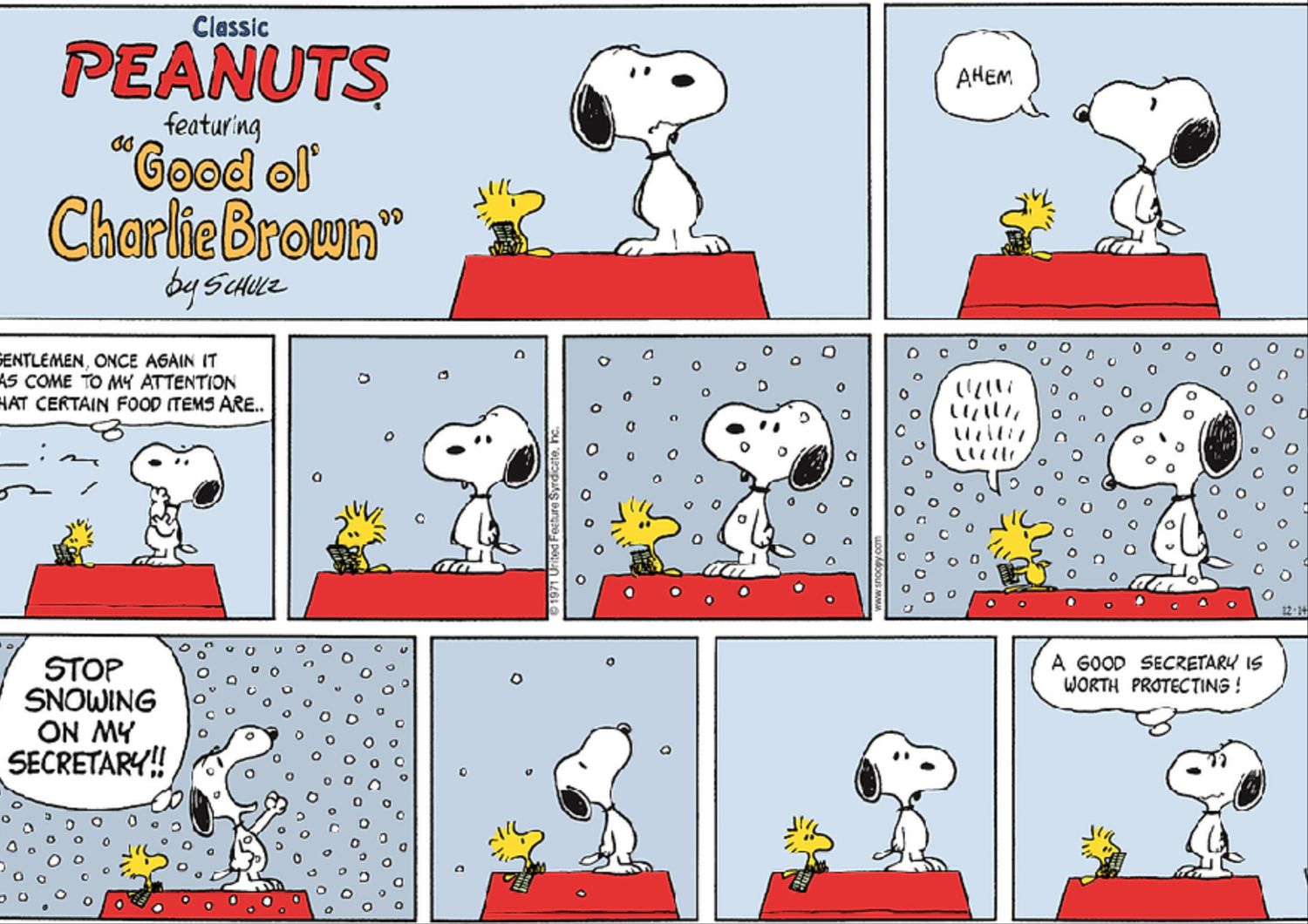 Woodstock, un mejor amigo y confidente, aparentemente también es el secretario de Snoopy, como se ve en esta tira. Cuando la nieve interfiere con las tareas de dictado de Woodstock, Snoopy estalla y grita para que deje de nevar. Su objetivo es proteger a su secretaria, sabiendo lo bueno que es Woodstock.