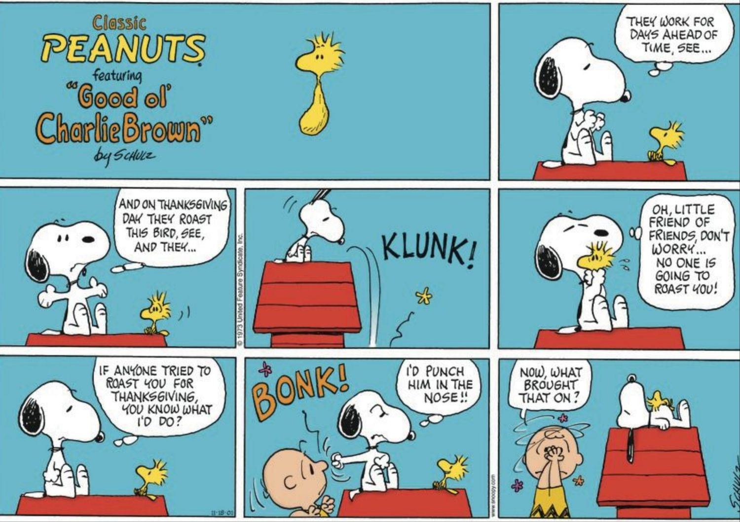 En la tira, Snoopy consuela a Woodstock, preocupado por la inminente amenaza del Día de Acción de Gracias. Snoopy le asegura que, en el peor de los casos, golpeará en la nariz a quien lo amenace. Es dulce cómo Snoopy no duda en defender a su amigo de cualquier amenaza. Desafortunadamente, Charlie Brown termina recibiendo la peor parte una vez más, pero aún así, el cuidado de Snoopy por su amigo es conmovedor.