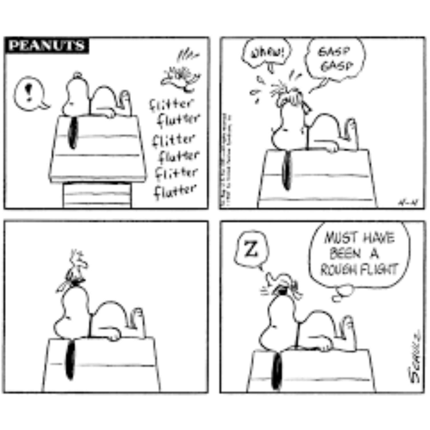Los mejores amigos, Snoopy y Woodstock, se conocen con frecuencia. Puede ser un consejo o una buena compañía, pero en el caso de esta tira, es un respiro después de un viaje largo y difícil. En la tira, Woodstock bate frenéticamente sus alas y se desploma sobre Snoopy, quedándose dormido casi de inmediato. Snoopy se da cuenta de que su amigo ha tenido un viaje difícil y necesita descansar, negándose a despertarlo incluso si Snoopy no se queda en la posición más cómoda para dormir.