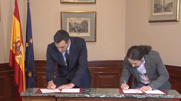 El presidente en funciones del gobierno español, Pedro Sánchez, y el líder de Podemos, Pablo Iglesias, sellaron un acuerdo para un “Gobierno de coalición progresista”.