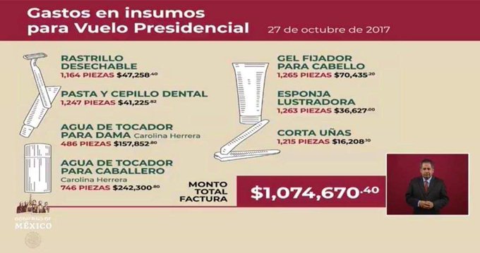El presidente Andrés Manuel López Obrador exhibió los gastos que hizo el expresidente Enrique Peña Nieto en artículos de higiene para los vuelos presidenciales. Durante la conferencia de prensa matutina, explicó que en una compra hecha el 27 de octubre de 2017, se gastaron en total 1 millón 74,670.40 pesos:
