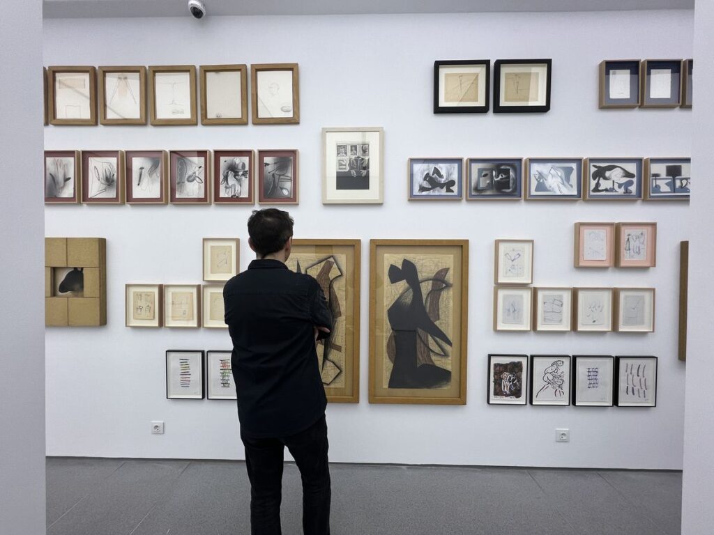 Primero, porque los dibujos de los cuadernos inéditos que se ven aquí en primicia están enmarcados dejando a la vista sus dorsos, también dibujados: otra buena metáfora de su trabajo. Segundo, porque así fue más fácil apreciar cada uno como letras o ideogramas del gran alfabeto y atlas mental del mundo de Espaliú que el galerista Mira Bernabeu ha compuesto luego con ellos sobre el largo muro que cierra la galería 1 Mira Madrid (por algo es también artista).