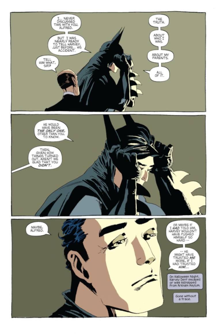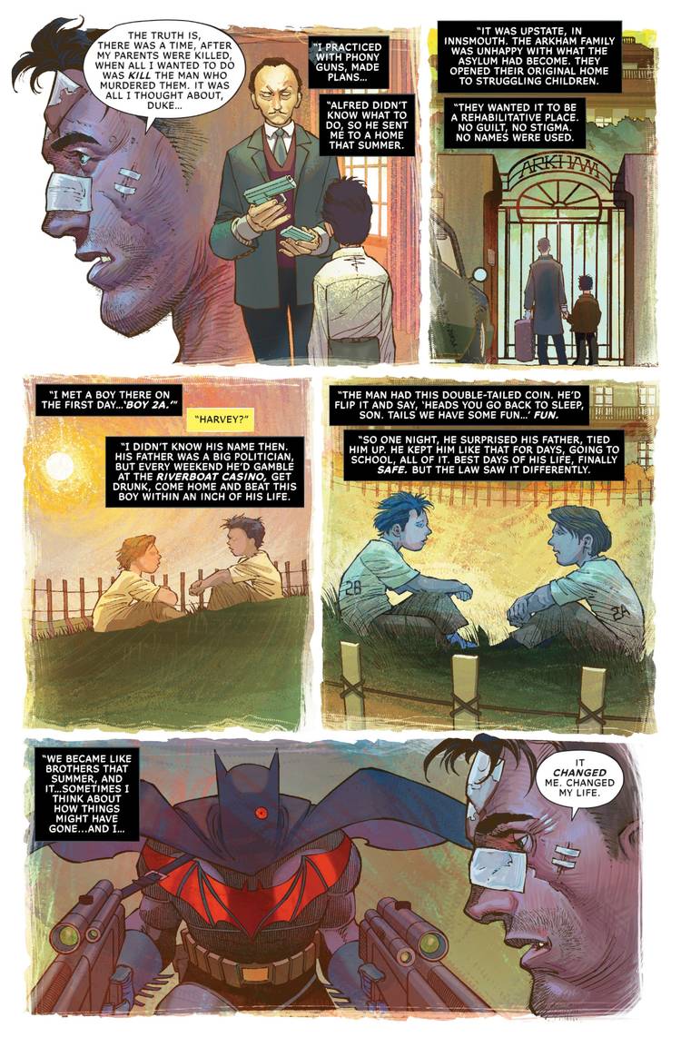 Incluso cuando era niño, Harvey cambió enormemente la vida de Bruce y aparentemente fue en parte responsable de la eventual regla de no matar de Bruce como Batman. Pero las similitudes y conexiones entre los dos personajes van incluso más allá de este encuentro casual. en una historia de Cómics de detectives #1066 de Simon Spurrier, Hayden Sherman, Nick Filardi y Steve Wands, se revela que Una de las primeras veces que surgió el personaje de Dos Caras fue cuando un joven Harvey Dent fue atacado en Crime Alley. por un grupo de hooligans: exactamente el mismo callejón donde nació Batman.