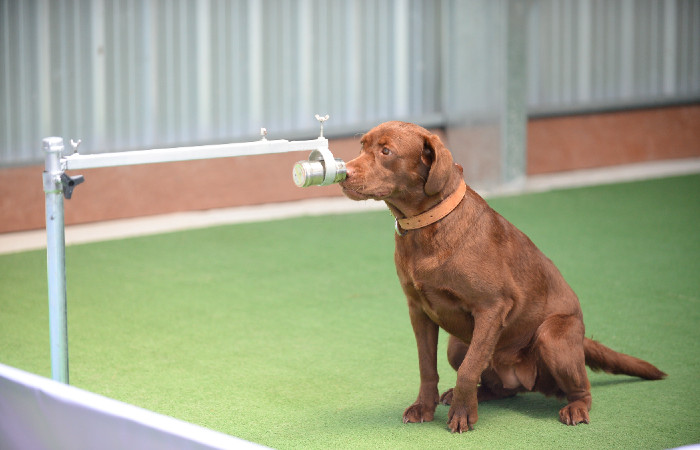 Seis labradores retriever participaron en un proyecto de seis meses que incluyó liberarlos para examinar el sudor de un paciente infectado en una rueda giratoria que tenía seis recipientes.