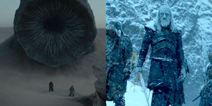 Así como los Caminantes Blancos son una amenaza constante para Game of Thrones personajes lo suficientemente desafortunados como para encontrarse más allá del muro, existe un peligro similar en los desiertos de Arrakis. A diferencia del Game of Thrones mundo, los habitantes del desierto de DunaEl mundo ha encontrado la manera de convivir con sus espeluznantes criaturas, a través del caminar sobre la arena, el proceso de caminar sin ritmo.