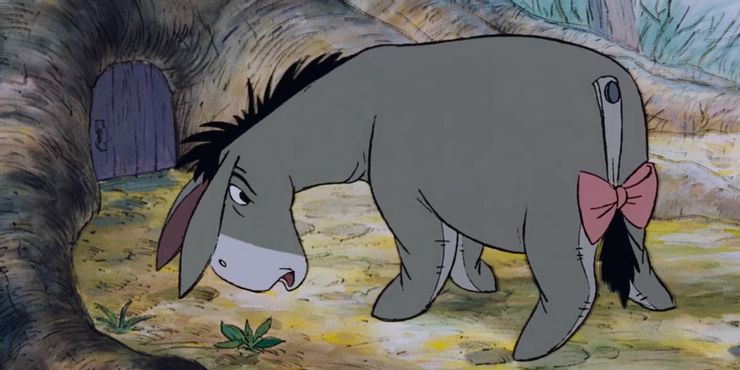 Un burro llamado Eeyore es amigo de Christopher Robin. A menudo se le presenta callado y gruñón, pero al público le encanta su personaje y se identifica con su pesimismo. Si bien su diálogo tiende a estar lleno de autodesprecio y desesperanza, hay más en él que eso. También ofrece palabras de consejo, inspiración y sabiduría.
