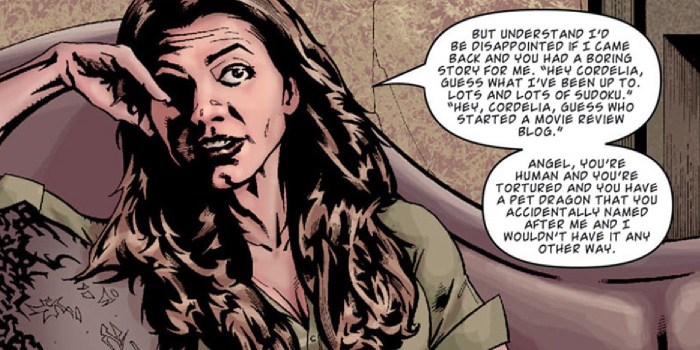 En Ángel: Después de la caída – de una variedad de escritores y artistas, incluidos Brian Lynch, Franco Urru, Joss Whedon y Elena Casagrande – Angel se ha convertido en humano y está gravemente herido. Habiéndose hecho amigo del dragón del final de la televisión, comienza a alucinar a Cordelia, a quien todavía ama y extraña. El dragón, que lo mantiene a salvo durante este tiempo, malinterpreta las acciones de Angel y piensa que su propio nombre debe ser Cordelia, un malentendido que persiste.