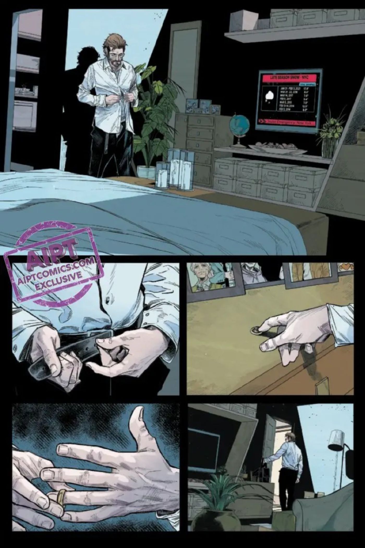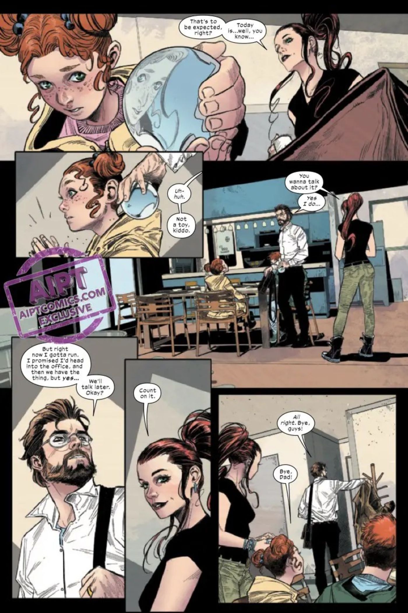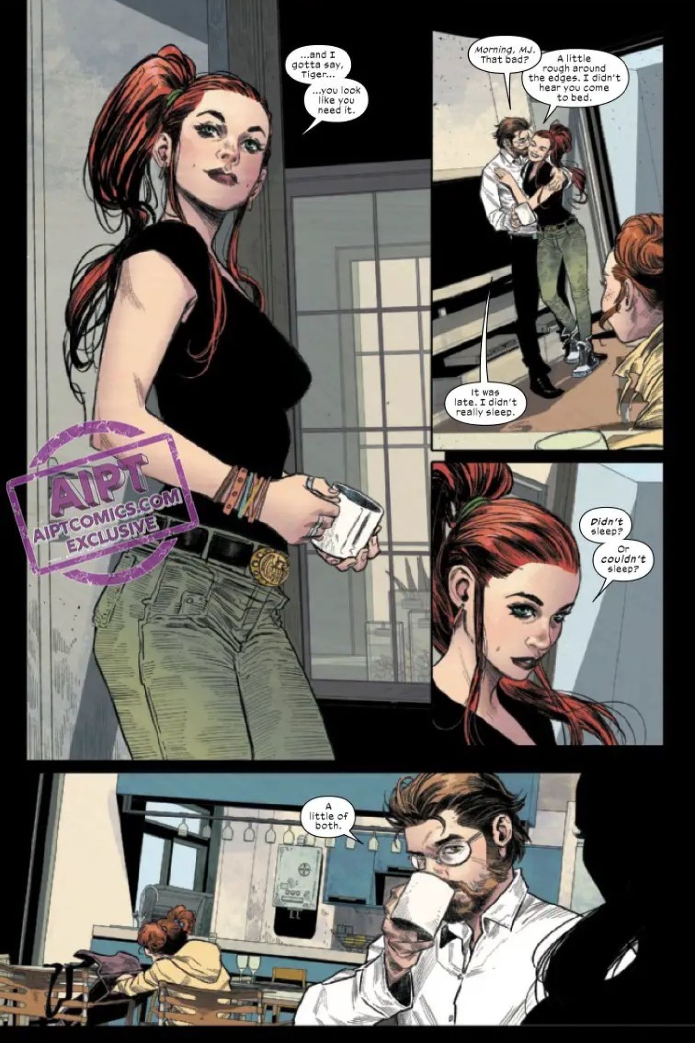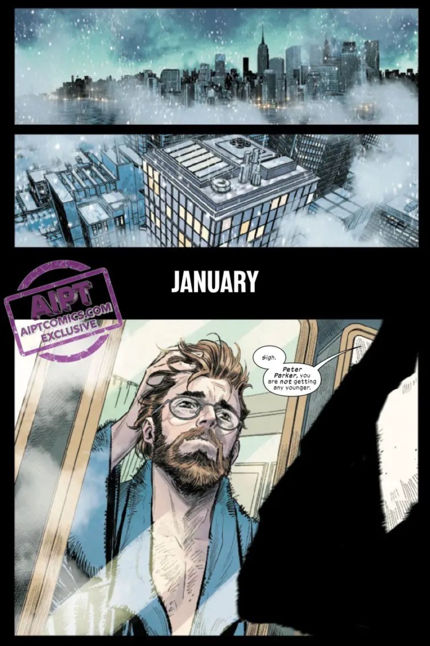 “/> El cómic comienza con Peter Parker saliendo de la ducha después de levantarse de la cama, mirándose en el espejo y diciendo: “Peter Parker, no te estás volviendo más joven”. Luego procede a verificar el clima, vestirse y reunirse con su familia en el comedor de su apartamento en la ciudad de Nueva York, donde bebe un poco de café, habla un rato con MJ y sus dos hijos antes de ir a trabajar. Peter se va con algo sin decir entre él y MJ, lo que deja a los lectores preguntándose cuál podría ser el tema.