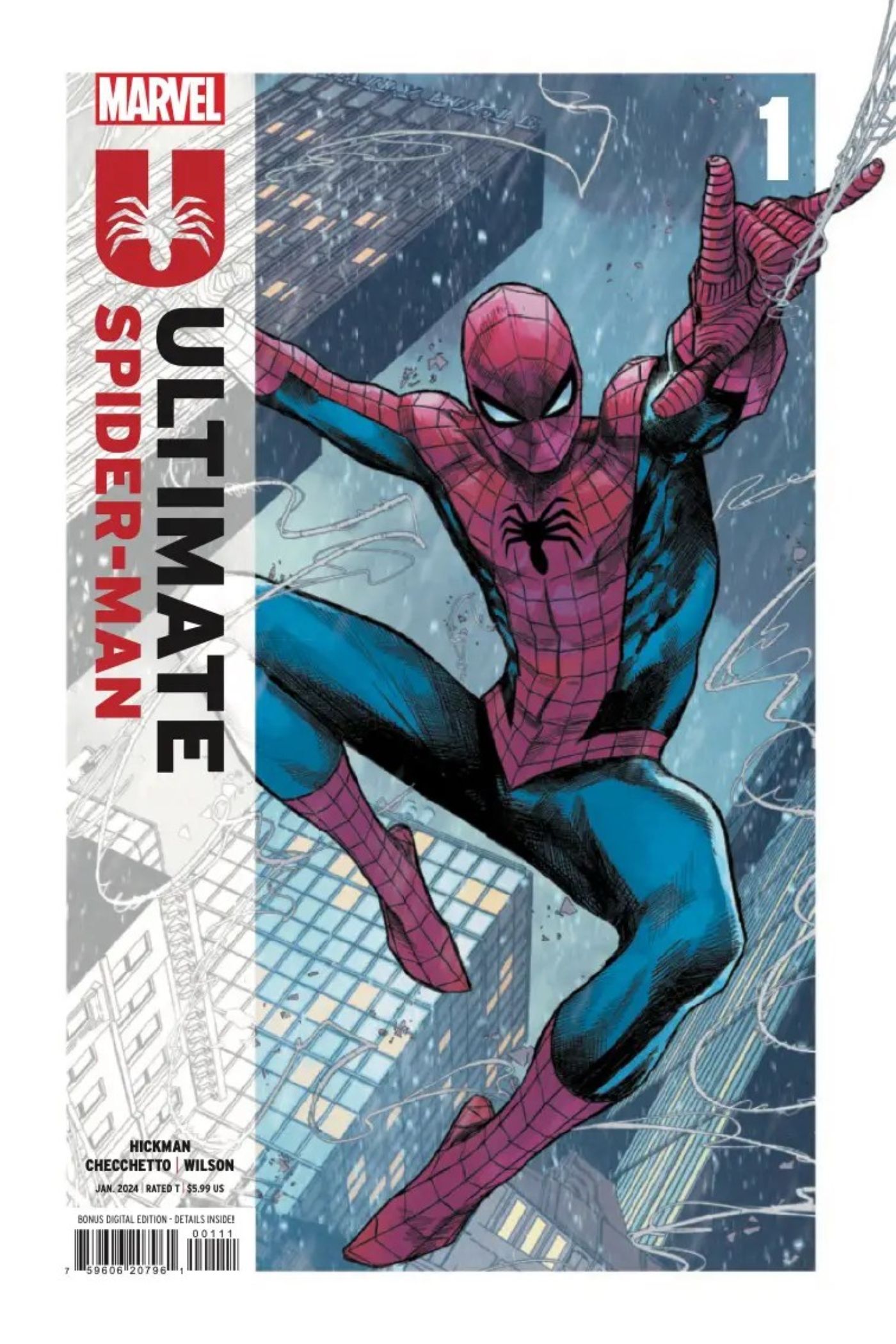 En una vista previa compartida por AIPT Comics para El último Hombre Araña #1 de Jonathan Hickman y Marco Checchetto, los fanáticos se encuentran inmediatamente con la portada del número, que muestra a Spider-Man con su icónico disfraz balanceándose por la ciudad de Nueva York. Sin embargo, una vez que comienzan a leer las páginas, los cambios en la vida de Peter de la Tierra-616 (e incluso de la Tierra-1610) a la Tierra-6160 (que es la designación del nuevo Universo Definitivo) se vuelven claros.