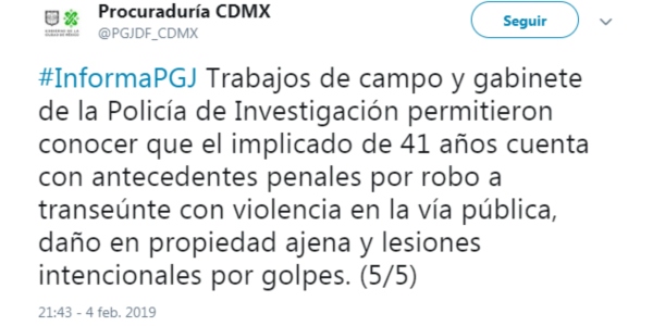 Ambos sujetos fueron detenidos y tras las primeras indagatorias, las autoridades encontraron que el sujeto detenido en Xola cuenta con cuenta con antecedentes penales por los delitos de robo a transeúnte con violencia en la vía pública, daño en propiedad ajena y lesiones intencionales por golpes.