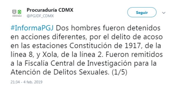 La Procuraduría General de Justicia de la Ciudad de México (PGJ-CDMX) informó que dos hombres fueron remitidos ante el Ministerio Público de la Fiscalía Central de Investigación para la Atención de Delitos Sexuales, luego de haber sido denunciados por el delito de acoso dentro de las instalaciones del Sistema de Transporte Colectivo-Metro.