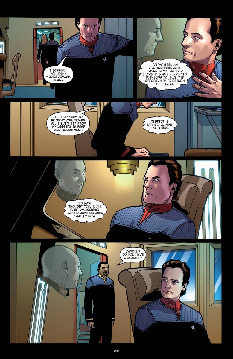 Star Trek: Alien Spotlight: Q #1 fue escrito por Scott y David Tipton y dibujado por Elena Casagrande. Q quiere experimentar la vida de Picard, y todos sus altibajos, por lo que se hace cargo del cuerpo del capitán, evitando la mente de Jean-Luc. A medida que se desarrolla el día, Picard comienza a ir a Goad Q. Q ha hecho una carrera al atormentar a Picard, pero ahora Picard lo está hurgando. En una escena, una frustrada V saltea a Picard sobre el respeto de la tripulación, y Picard lo pone en su lugar sobre el asunto.