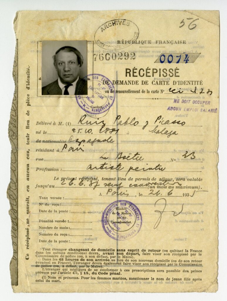 La segunda fecha clave para Picasso en Francia en el 3 de abril de 1940. Ese día, Picasso firma, con su caligrafía característica, una demanda para nacionalizarse francés. Ya es una celebridad, el gran artista del siglo XX, consagrado en París y en Nueva York, un multimillonario comprometido con la República española y el antifascismo, un clásico vivo. Y cuenta con el aval de influyentes personalidades francesas. En vano. En un informe de cuatro páginas, Émile Chevalier, inspector general adjunto de la Prefectura de la Policía, recoge la falsa acusación de anarquismo del informe de 1901, la adereza con otros rumores y maledicencias, y concluye: “Este extranjero no tiene ningún título para obtener la naturalización; por otra parte, y después de lo dicho, se le debe considerar como sospechoso desde el punto de vista nacional”.