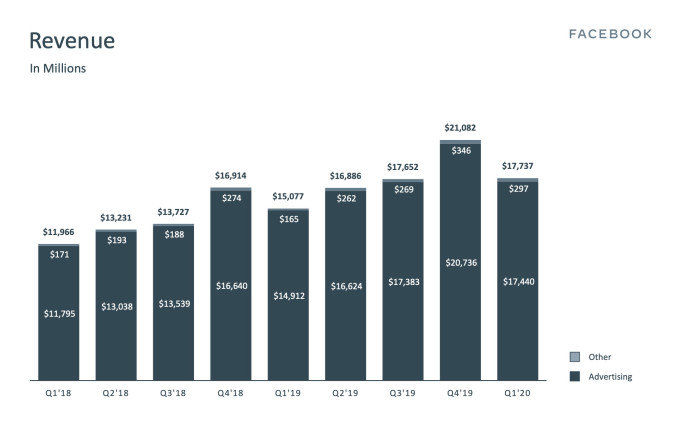 La compañía dijo que no proporcionaría orientación para el segundo trimestre del año 2020 completo, sino que indicó que las primeras tres semanas de abril indicaron un crecimiento plano año tras año en el enorme negocio de anuncios de la compañía. Los ingresos publicitarios de Facebook para el cuarto trimestre de 2019 indicaron un crecimiento anual del 25% en comparación.