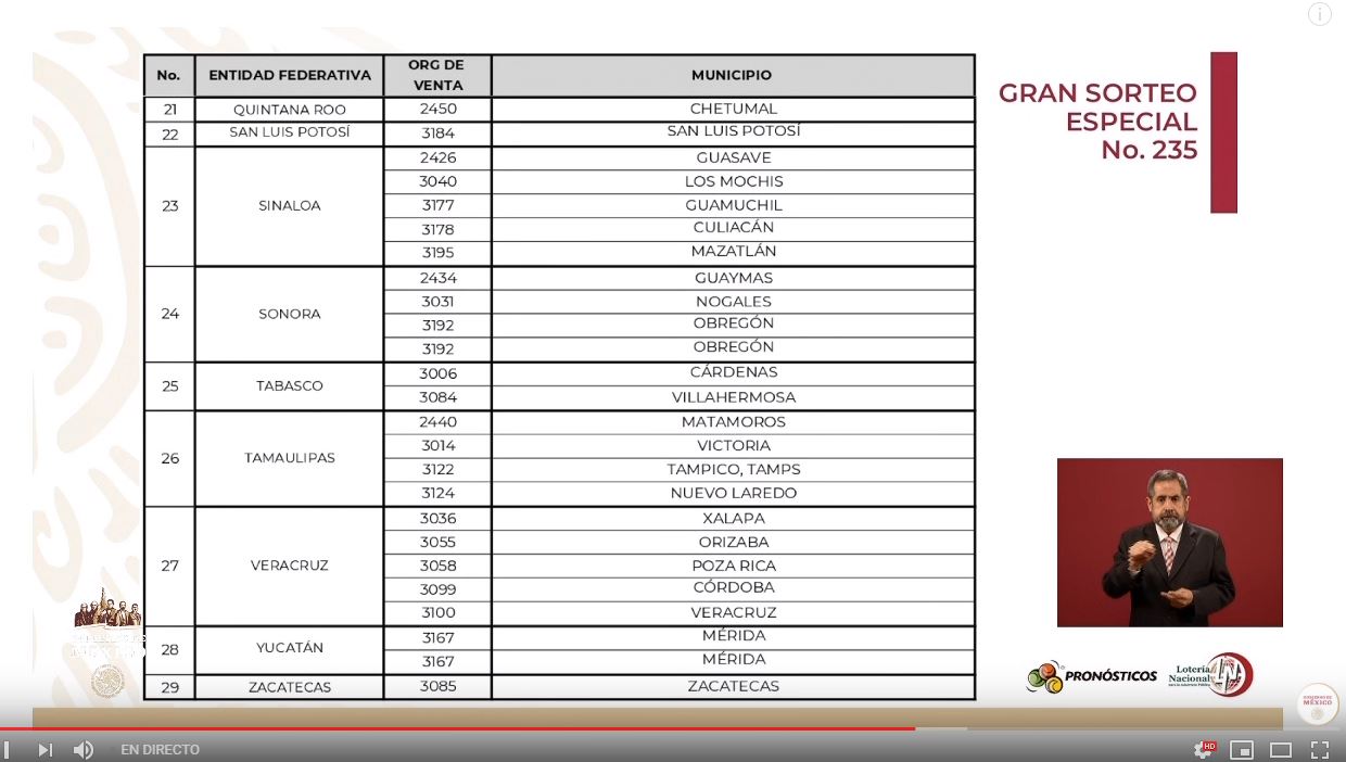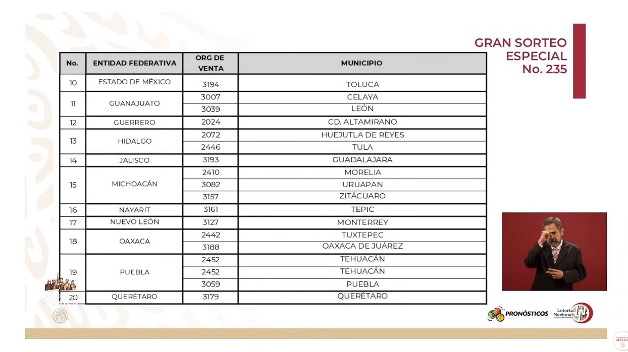 Por su parte, Ernesto Prieto Ortega, director general de la Lotería Nacional para la Asistencia Pública, señaló que el gran sorteo especial 235 y inició la venta de los billetes que tendrán la numeración del 0,000,000 al 5,999,999.