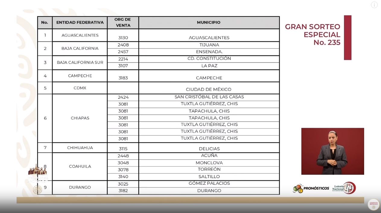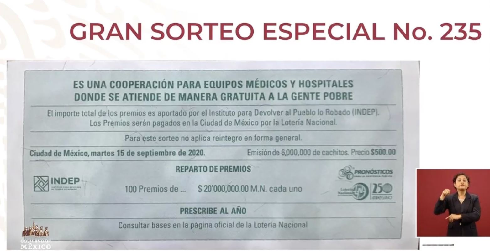 Por su parte, Ernesto Prieto Ortega, director general de la Lotería Nacional para la Asistencia Pública, señaló que el gran sorteo especial 235 y inició la venta de los billetes que tendrán la numeración del 0,000,000 al 5,999,999.