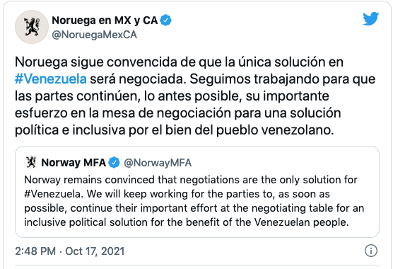 “Seguimos trabajando para que las partes continúen, lo antes posible, su importante esfuerzo en la mesa de negociación para una solución política e inclusiva por el bien del pueblo venezolano”, publicó en Twitter.