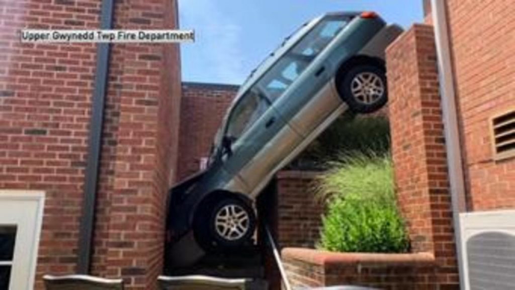 “El vehículo pasó por una serie de escalones, rompió una pared, y estaba como levantado en el aire en un ángulo de 45 grados”, dijo el oficial de la Policía de Upper Gwynedd, Matthew Toro.