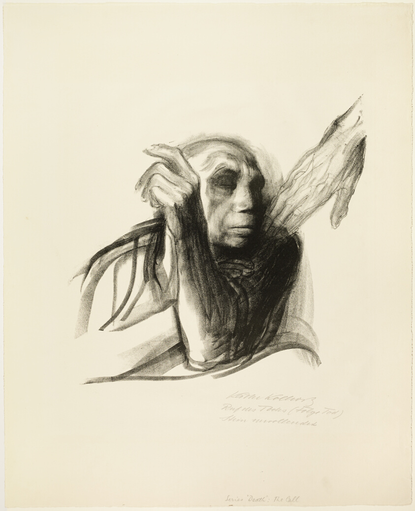 Käthe Kollwitz enfrentó su muerte a través del autorretrato. Su compromiso con la observación de un mundo que se pudre y renace cíclicamente se hace evidente en cada una de sus imágenes, sobre todo en las pintadas y esculpidas después de cumplir los 40 años. La potencia disminuye, decía. En una entrada del mes de abril de 1910, habla de la obra de sus contemporáneos jóvenes. “La juventud tiene derecho a mirar el futuro con sus ojos llenos de fantasía”. Cierra la puerta y vuelve a lo suyo: entre la cabeza que mira hacia la mano de la muerte que entra por la zona superior derecha del papel y la mano de la propia figura, abre una grieta de luz. Su dedo apunta al cielo. La mano de la muerte presiona su hombro. Ha empezado su descenso a la tierra.