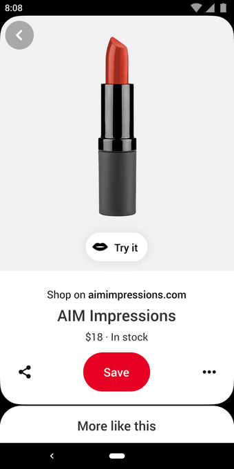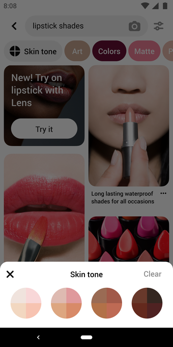 Pinterest dice que no alterará tu foto usando suavizado de piel u otras técnicas, por lo que puedes estar seguro de cómo se ve el lápiz labial en tu verdadero yo. Además, la función se ha integrado con la función de rango de tonos de piel existente de Pinterest, por lo que los usuarios pueden comprar tonos de labios similares en tonos de piel que coincidan con los suyos.