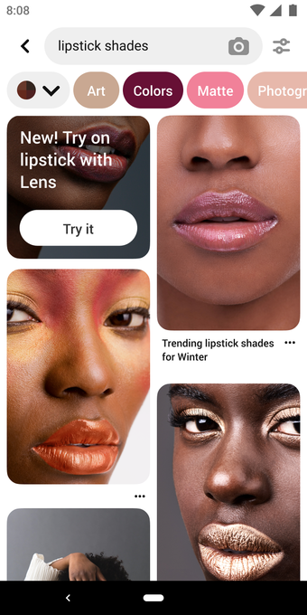 Otra forma de acceder a Probar es escribiendo términos relacionados con el lápiz labial en el motor de búsqueda de Pinterest, como “lápiz labial de ciruela” o “labios rojos”, por ejemplo.