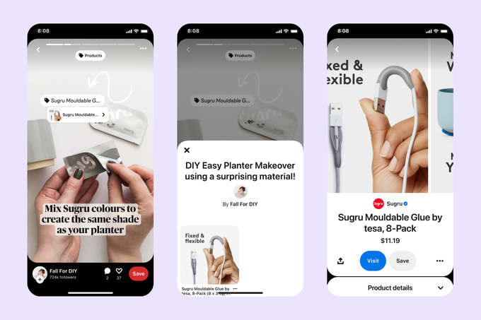 Ahora, explicó Pinterest, los creadores también podrán etiquetar productos en sus pines. Eso significa que los fanáticos que ven el contenido del pin ahora pueden pasar de la inspiración a comprar en la aplicación Pinterest. Sin embargo, el camino no es tan sencillo como lo es en Instagram, donde un toque en una etiqueta lo lleva a una página donde luego puede agregar un artículo a un carrito de compras. En cambio, las etiquetas de producto de Pinterest tienden a llevarlo a otra página de Pinterest para el producto en cuestión, y desde allí debe hacer clic nuevamente para visitar el sitio web del minorista y completar su pedido.