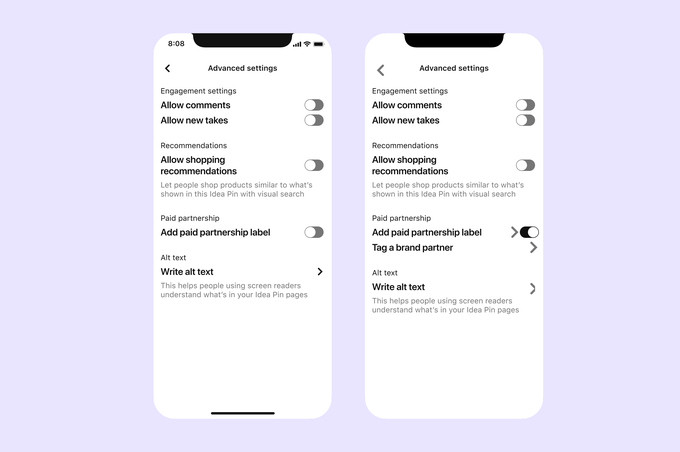Cuando luego produzcan contenido de marca en Pinterest y agreguen las marcas a sus Idea Pins, la marca podrá aprobar la etiqueta y el Idea Pin incluirá una etiqueta que diga “Paid Partnership”.