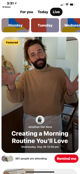 Pinterest se está expandiendo a eventos en vivo. La compañía planea organizar un evento virtual de tres días que contará con sesiones en vivo de los mejores creadores, incluidos grandes nombres como Jonathan Van Ness y Rebecca Minkoff, entre otros. El evento virtual se llevará a cabo dentro de la aplicación Pinterest desde el 24 de mayo hasta el 25 de mayo, y servirá como la primera prueba pública de la compañía de transmitir contenido de creadores directamente a sus más de 475 millones de usuarios globales.