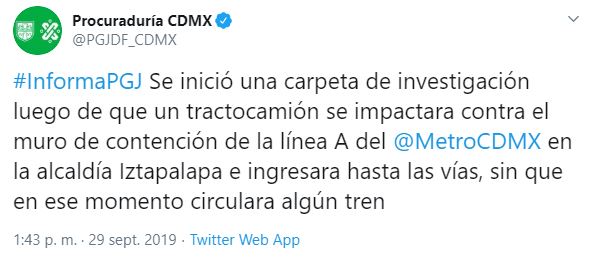 La Procuraduría General de Justicia de Ciudad de México (PGJCDMX) inició una carpeta de investigación por el accidente de un tráiler que se impactó contra el muro de contención de la Línea A del Sistema de Transporte Colectivo (STC) Metro, y cuyo conductor huyó del lugar de los hechos.