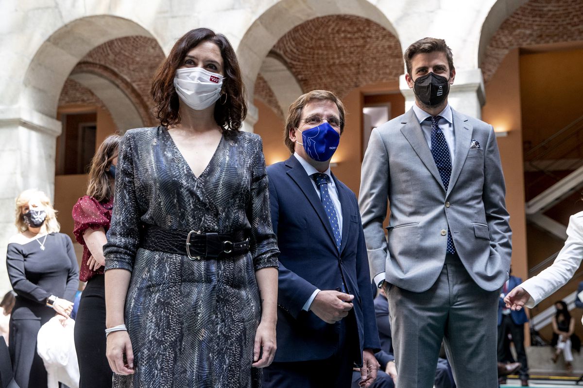 A mediodía, el patio central de la Real Casa de Correos, en la Puerta del Sol de Madrid, se transforma en un ir y venir de personas hasta que Gerard Piqué irrumpe por ahí con sus 193 centímetros de estatura, trajeado de arriba abajo, y todos los focos apuntan hacia él, flanqueado en la foto por el alcalde de la capital española, José Luis Martínez-Almeida, y la presidenta de la Comunidad, Isabel Díaz Ayuso.