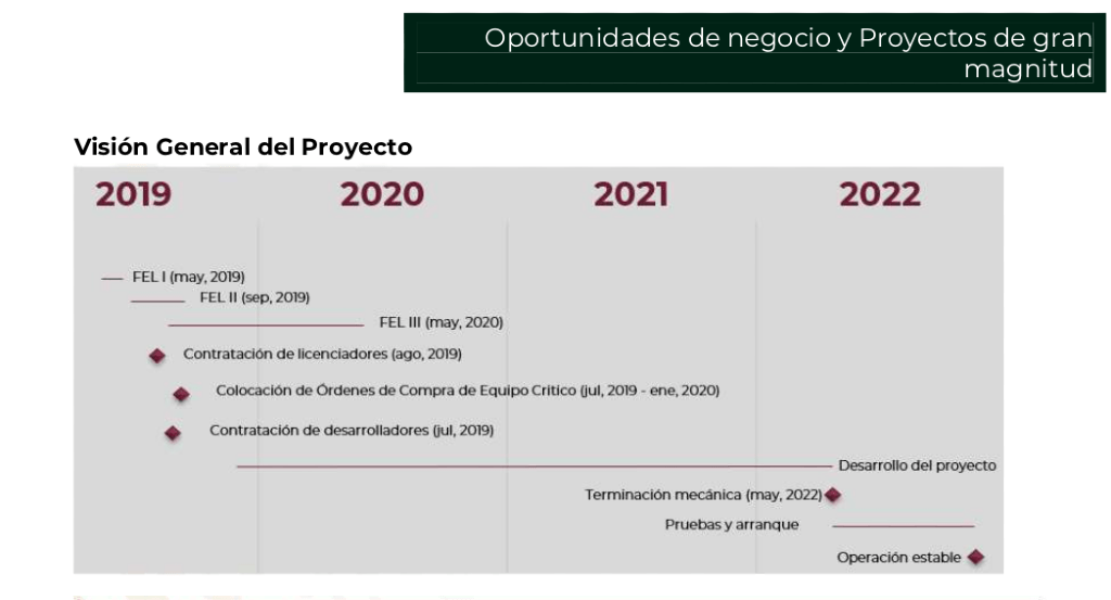 El Plan de Negocios de Petróleos Mexicanos (Pemex) 2019-2023 presentado por el gobierno del Presidente Andrés Manuel López Obrador (AMLO) contempla ocho proyectos de gran magnitud, entre los que destaca la construcción de la nueva refinería en Dos Bocas, Tabasco, cuyo arranque de operación se ha pospuesto hasta el año 2022.