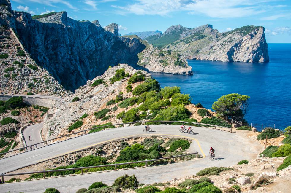 La isla también es popular por sus rutas en bicicleta y sus 2.071 kilómetros de carreteras y caminos locales, que la han convertido en un destino de referencia para ciclistas aficionados y profesionales de todo el mundo. La ruta de Sa Calobra es una de las más conocidas y complicadas, solo apta para deportistas bien entrenados. La carretera tiene forma de culebra y serpentea entre un abrupto paisaje rocoso que no pierde de vista el Mediterráneo a lo largo de sus 14 kilómetros, en los que se agolpan hasta 12 curvas de 180 grados. En uno de sus puntos más icónicos, conocido como nudo de corbata, el asfalto pasa por debajo de sí mismo, formando un ángulo de casi 360 grados.