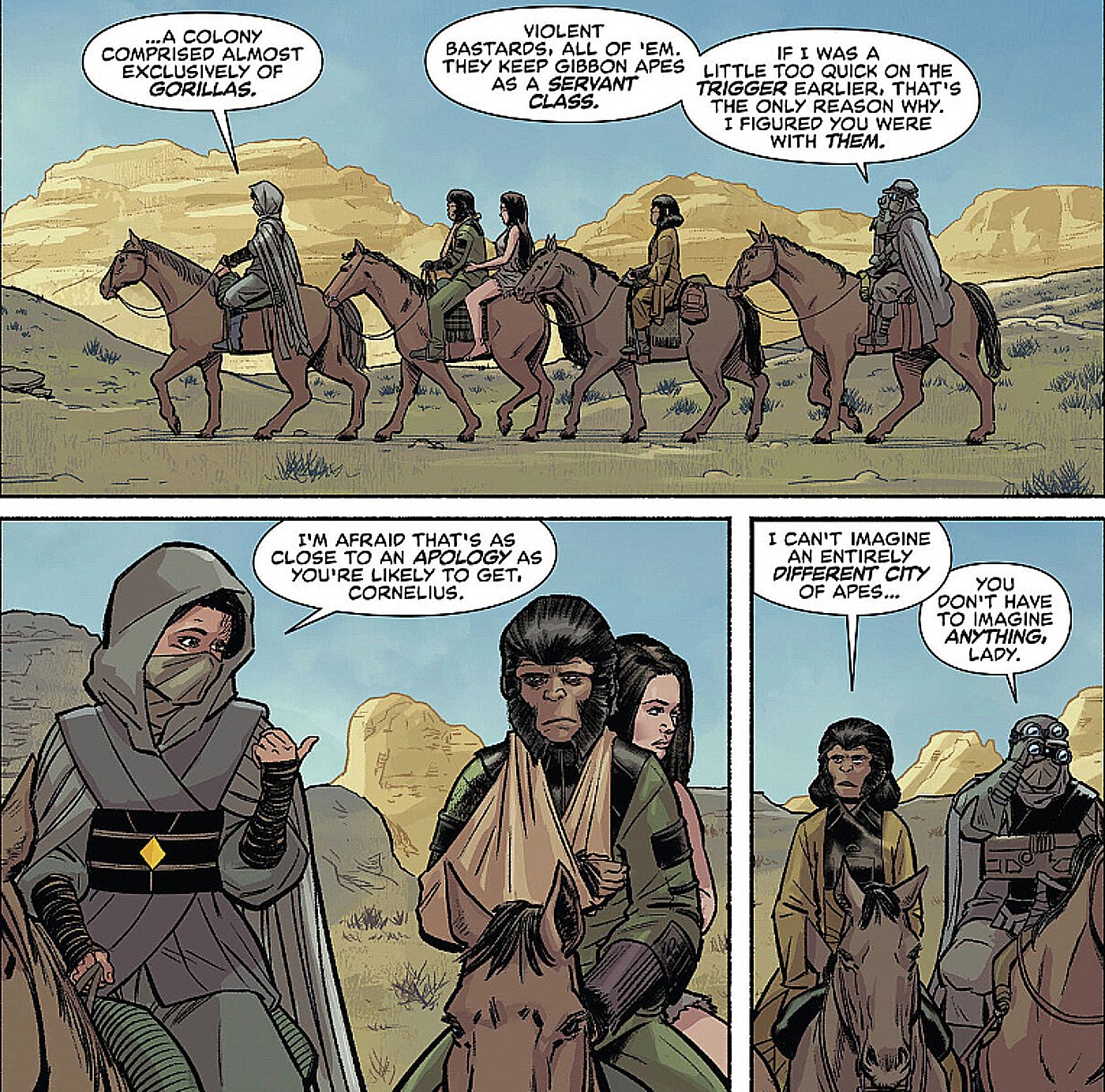 Los humanos, liderados por una mujer llamada Ivana, aceptan ayudar a los chimpancés a encontrar a su sobrino Lucius, que actualmente está cautivo de los gorilas Hominidae. Uno de los humanos menciona a los Hominidaes “mantener a los simios gibones como clase sirviente“.
