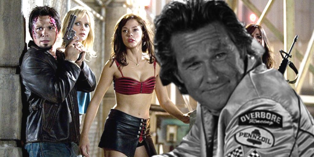 El punto de Grindhouse fue traer de vuelta la experiencia de ver películas dobles de explotación. Estas películas se caracterizan por el uso de géneros de nicho y visuales espeluznantes con mala calidad de impresión, lo que les da un aspecto ligeramente inquietante. Planeta del terror Tomó estos elementos muy en serio, con una historia de zombies como los de la década de 1970 y los efectos que hacen que la película se vea dañada y como si hubiera salpicado de sangre. Incluso tiene un salto de tiempo menor como si le faltara parte del carrete. Prueba de la muerte También tenía el aspecto dañado, pero no lo usó para su ventaja como Planeta del terror hizo.