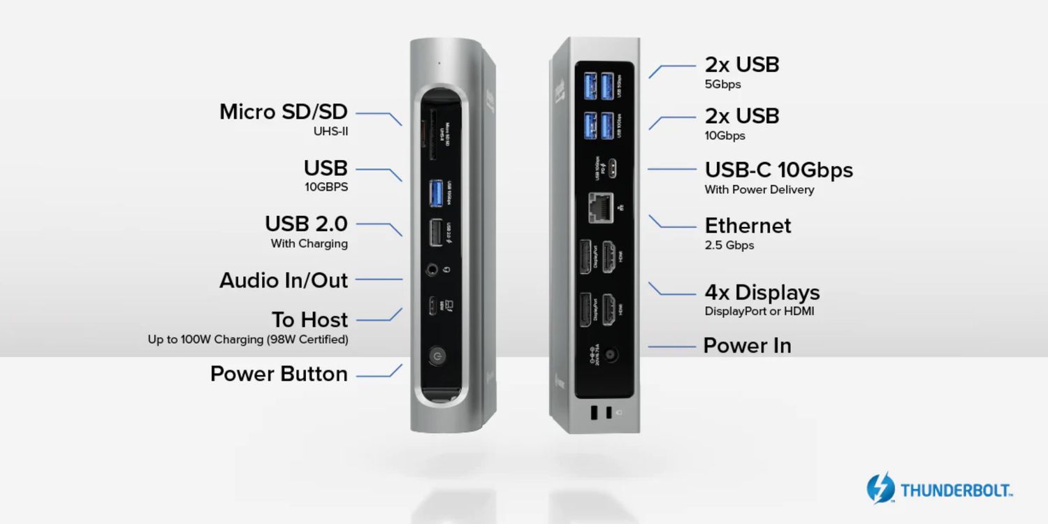 enchufable, una empresa que crea bases para brindar conectividad tecnológica sin utilizar puertos de computadora integrados, presentó en CES 2023 una base Thunderbolt 16 en 1 que puede alimentar cuatro pantallas 4K con una sola conexión USB4/Thunderbolt. En computadoras portátiles y algunas computadoras de escritorio pequeñas y portátiles, los fabricantes han abandonado una serie de opciones de entrada y salida en favor de puertos universales como USB-C. Sin embargo, no todos los puertos USB-C son iguales. Los puertos USB-C que admiten el estándar de conexión USB4/Thunderbolt son capaces de alcanzar altas velocidades de transferencia de datos, y las bases Thunderbolt aprovechan este potencial al agregar más opciones de conectividad mientras usan un solo puerto.