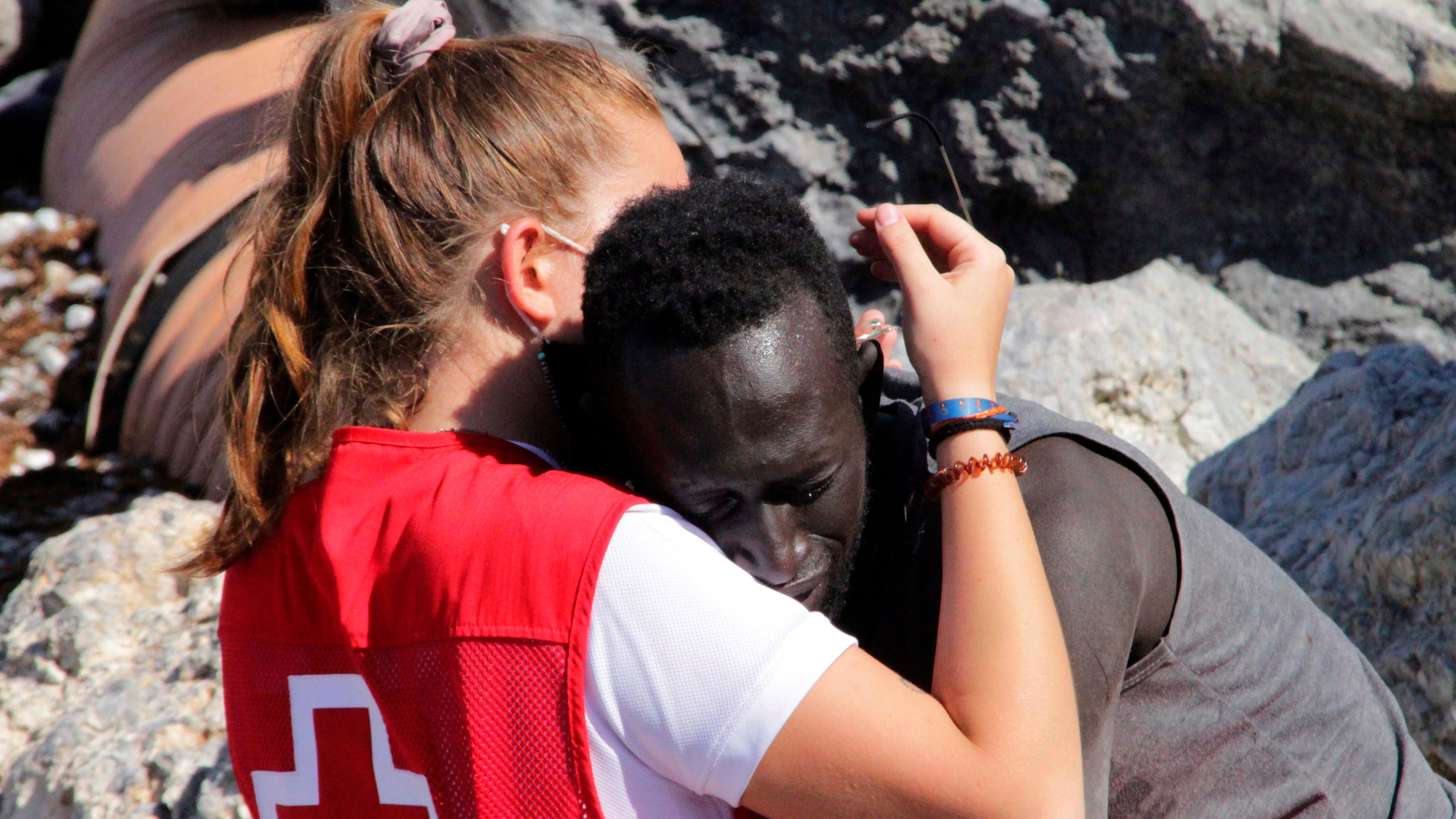 En ella, una voluntaria de Cruz Roja consolaba a uno de los migrantes, en este caso un senegalés, que, exhausto, había alcanzado la costa española.