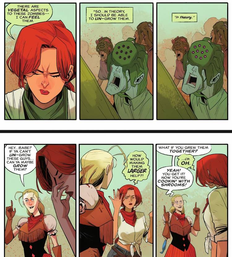 Para evadir a las sirenas, Punchline desata una horda de plantas zombis, que rápidamente abruman a Harley, Ivy y Dumb Bunny. Cuando las cosas empeoran, Harley sugiere que Ivy “crecer” Los zombis vegetales. Aunque esta medida parece contraproducente al principio, Esto lleva a Ivy a crear una forma de planta gigante de ella misma hecha a partir de los zombies.