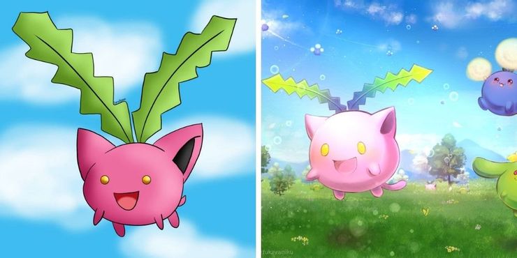 Hoppip es una criatura redonda con un pigmento rosa chicle y ojos amarillos como perlas, así como hojas verdes como helicópteros en su cabeza. Su nombre proviene de las palabras “hop” y “pip”, que es una semilla. Este lindo Pokémon evoluciona de este a Skiploom y finalmente a Jumpluff. Junto con las lindas características de Hoppip, también flota y se desliza en el viento y, a menudo, señala la primavera.