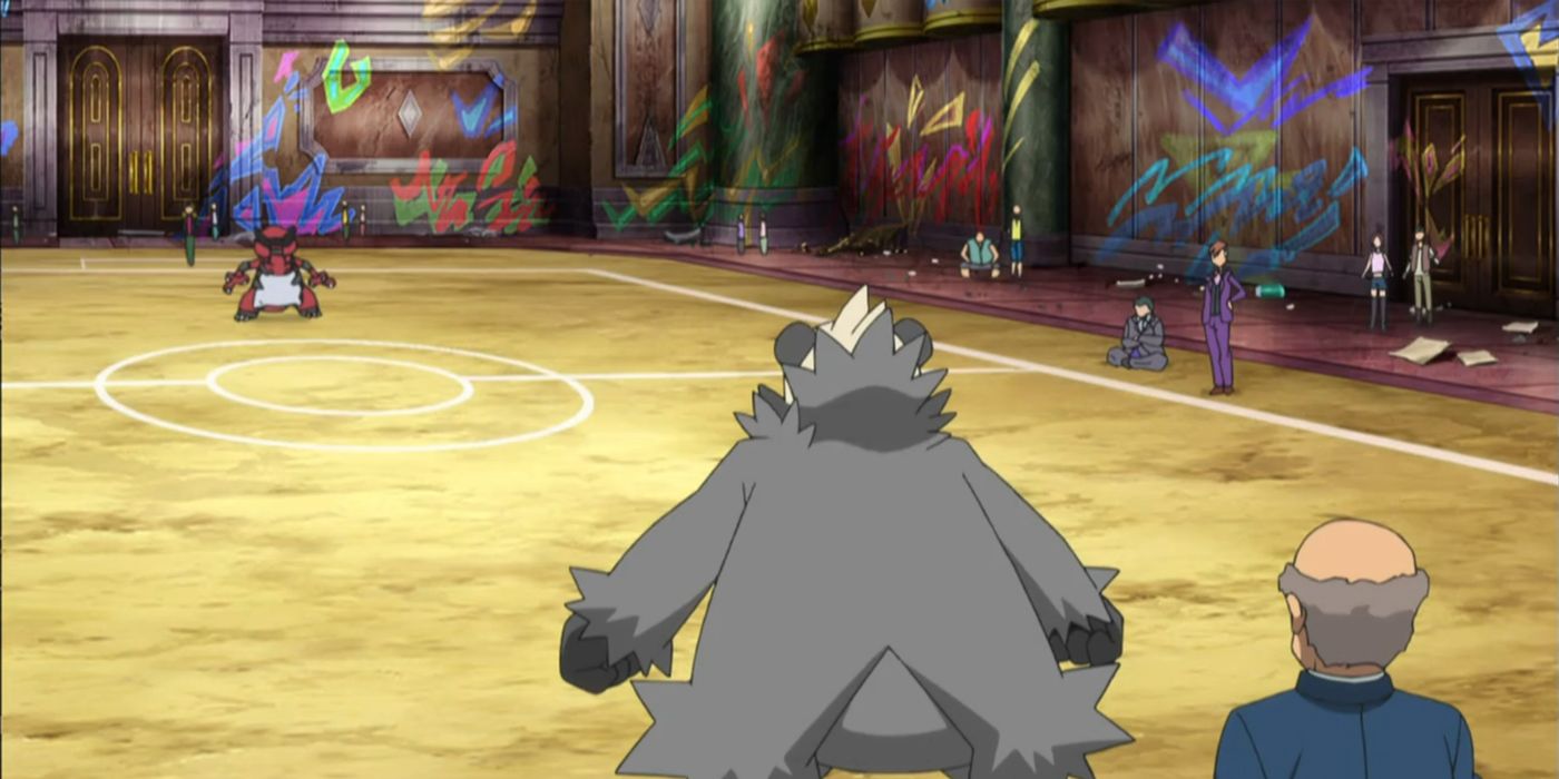 “/> La batalla se muestra teniendo lugar en un campo de batalla dentro del hotel, donde las miradas indiscretas no pueden encontrarla fácilmente. El área está cubierta de graffiti y Mantle tiene muchos matones dando vueltas para ayudarlo a hacer cumplir la regla de “el ganador se lo lleva todo”. Parece ser un lugar de reunión popular para los inútiles, a quienes también se les ve viendo las batallas y riéndose de la pérdida del entrenador Pangoro, y la operación ha existido durante al menos 10 años. En el pasado se revela que Ash viaja a ese Mantle y tuvo una batalla con el Rotom del propietario, compitiendo por la propiedad del hotel, y que Rotom huyó, lo que le hizo perder por defecto y dejando en claro cómo el hotel se convirtió en un sitio para batallas clandestinas. en primer lugar.