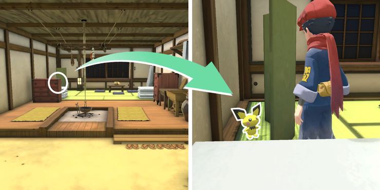 Escondiéndose detrás de las pantallas, Pokémon Leyendas: Arceus Entrenador descubrirá un Pichu. Sorprendida por los chillidos de los Pokémon, Sanqua entrará en la casa para investigar el ruido. Durante una breve escena, Sanqua revelará que ayudó a Pichu hace algún tiempo. Una vez que termine la conversación, Sanqua recompensará al jugador con Nanab Berries ×7. Estas bayas son consumibles útiles que se pueden alimentar a un Pokémon para restaurar un tercio de su HP máximo.