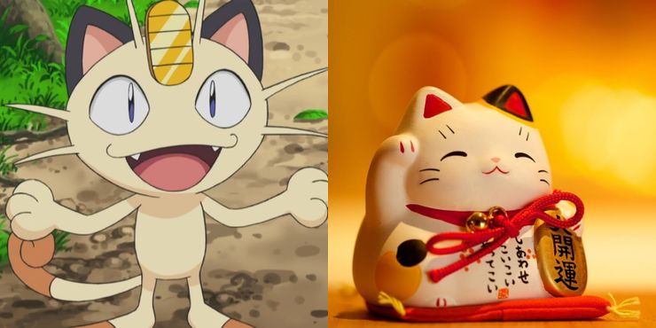 Maneki-neko se puede encontrar en las entradas de los negocios en todo Japón y sirve como amuleto de buena suerte. Son tradicionalmente pequeñas estatuas de gatos de color crema o percal, hechas de cerámica o plástico, con una pata levantada en un gesto de señas. Se cree que los Maneki-neko traen buena fortuna, y algunos de los sprites de Meowth en pokémon los juegos se colocan sentados con una o ambas patas levantadas, como un maneki-neko. Muchos maneki-neko sostienen o usan una moneda koban de la era Edo como decoración, y la moneda que lleva en el centro de la frente de Meowth se parece a una.