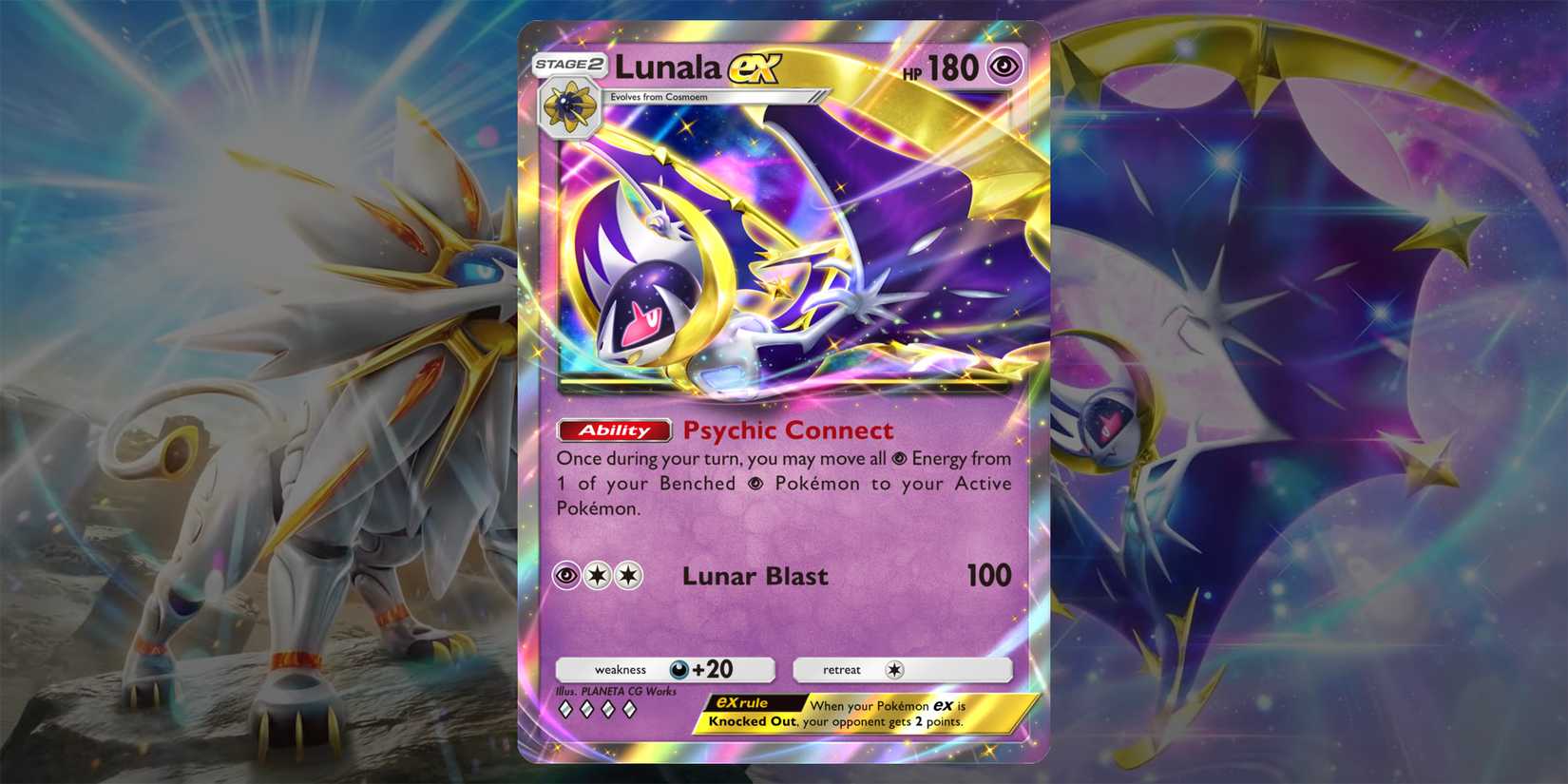 Guardianes celestiales Se centrará en Pokémon visto por primera vez en Pokémon Sun y Moon. El nuevo conjunto contendrá más de 200 cartas y contará con Solgaleo y Lunala como mascotas de paquete de refuerzo. Aunque no se revelaron nuevos trucos o tipos de tarjetas para este conjunto, Se confirma que el set contará con la primera tarjeta de entrenador de arte inmersivo, Con Lillie, una de las protagonistas de Pokémon sol y luna.