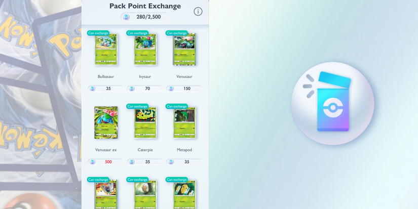 La última forma de agregar cartas a tu colección es mediante el uso de puntos de paquete. Esta es una herramienta vital con la que los jugadores pueden cometer errores fácilmente. Por cada paquete que abres, obtienes cinco puntos de paquete, que pueden canjearse por tarjetas cuyo precio aumenta según la rareza.. Las tres cartas raras cuestan 150 puntos de paquete, mientras que las cartas EX cuestan la friolera de 500. Además de esto, si quieres coleccionar las cartas de edición especial adicionales, cuestan aún más.