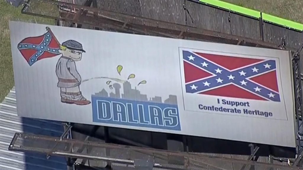 Un anuncio a un lado de una carretera texana ha generado una gran controversia en redes sociales a favor y en contra de la imagen que muestra a un soldado confederado (en forma de caricatura) orinando sobre la ciudad de Dallas.