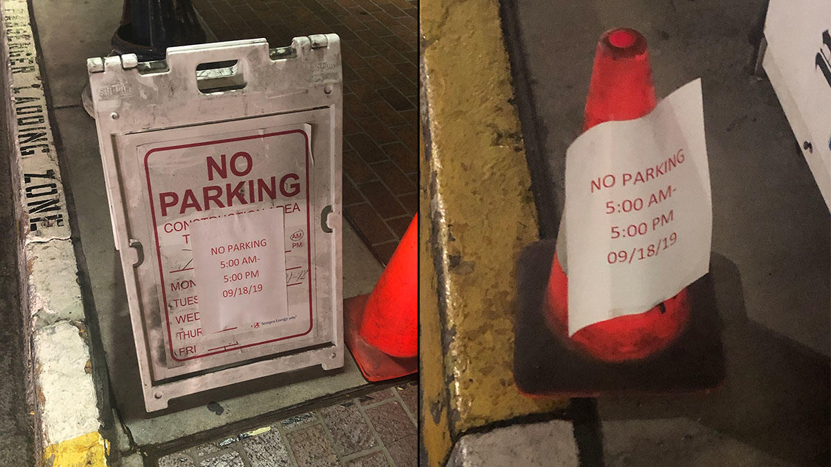Los fotógrafos de la estación tomaron videos y fotografías de los letreros que carecían parte o toda la información requerida, incluido el nombre y la fecha del evento, un número de teléfono de contacto y las iniciales “SDPD” para confirmar que la orden de no estacionarse había sido autorizada por las autoridades.