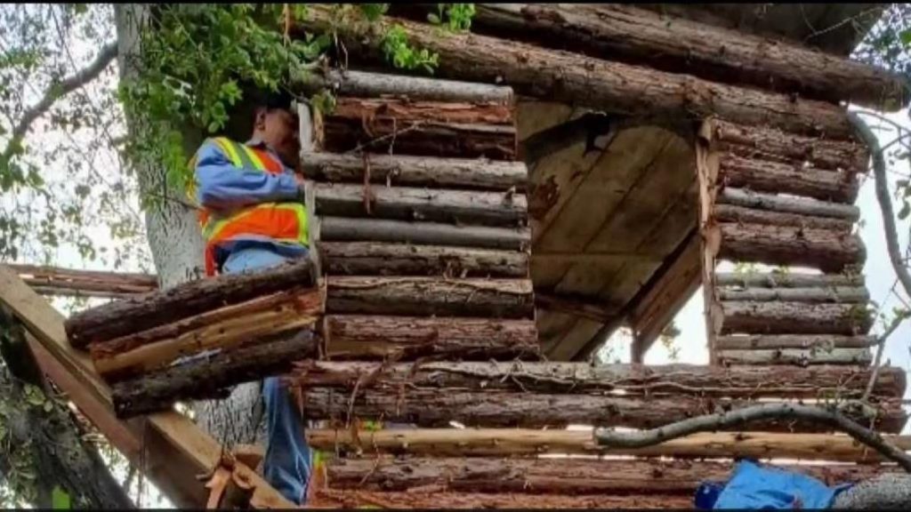 La casa del árbol estaba bastante bien equipada, con una barbacoa e iluminación, e incluso un saxofón y un reloj de cuco, dijo la policía. Las autoridades planeaban demolerla el viernes.